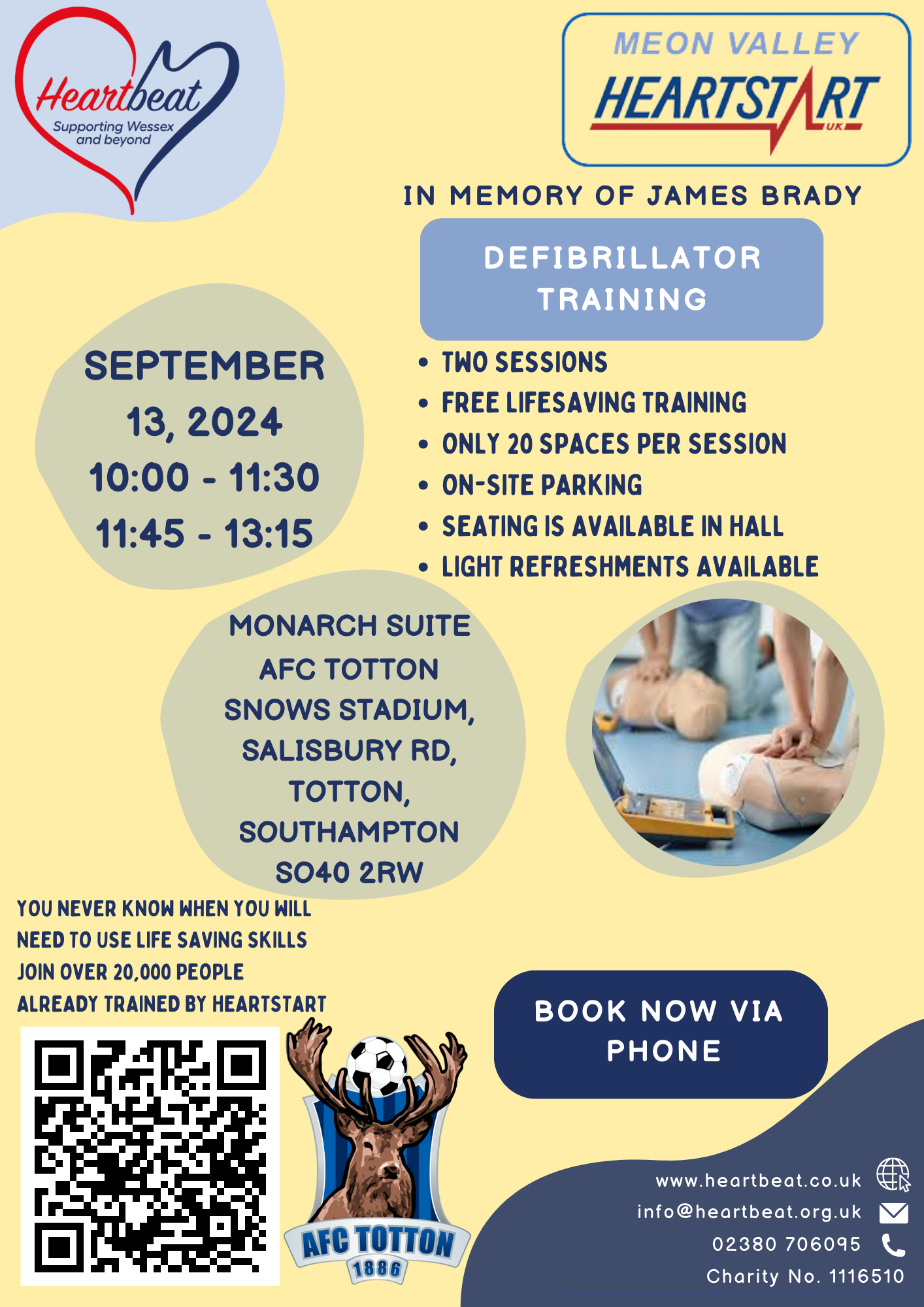 The Hampshire-based charitable organisation will be leading two sessions in AFC Totton's Monarch Suite on Friday 13 September - the first from 10:00am to 11:30am, and the second from 11:45am to 1:15pm - in which they will be providing FREE training on how to use a defibrillator.